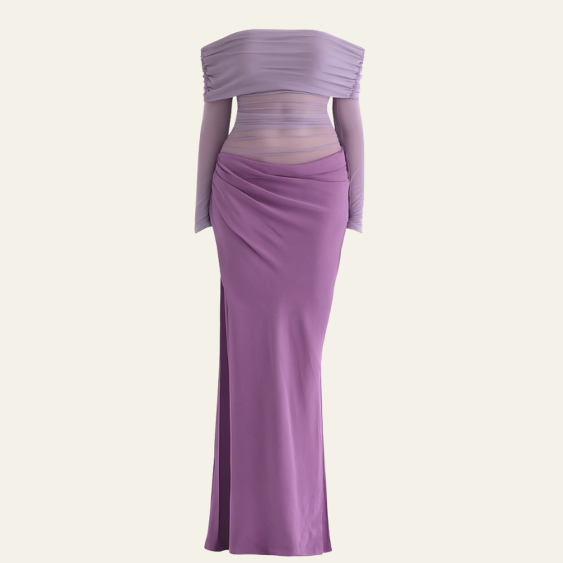 A women’s evening dress tailored for refined European elegance and modern allure. With sheer detailing and an off-shoulder drape, it strikes the perfect balance of sophistication and contemporary design. Ideal for Riviera holidays or styled with heels for late-night gatherings.