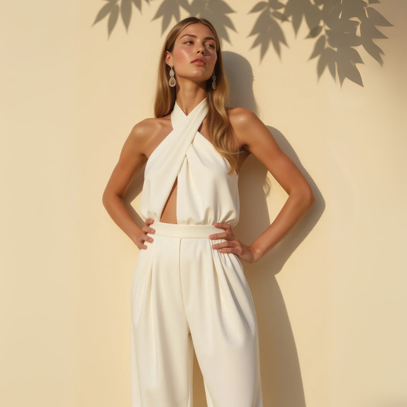 A women’s halter-neck jumpsuit designed for refined European elegance, blending a fluid silhouette with a modern cross-front detail. Crafted with a smooth drape and understated sophistication, it moves effortlessly from coastal days to evening aperitifs. Perfect for Riviera holidays, garden parties, or styled with statement earrings for sunset dinners.