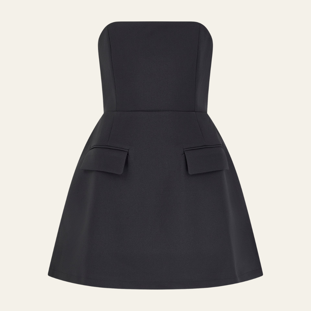This women’s strapless mini dress embodies timeless evening elegance with its clean lines and sculpted silhouette.