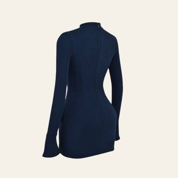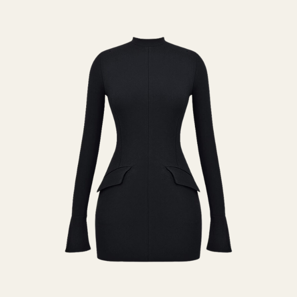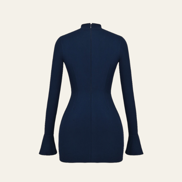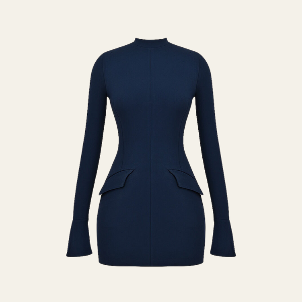 A women’s mini dress tailored with architectural precision and sleek modernity. Crafted in a deep navy hue, it features a high neckline, long fitted sleeves with subtle flare cuffs, and sculpted seams that contour the body. The structured mini silhouette is finished with statement flap details at the waist, blending elegance with a touch of edge.