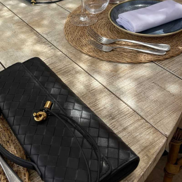 A woven leather clutch designed for timeless elegance and discreet luxury. Handcrafted with supple leather and finished with a polished gold-tone knot detail, it captures refined European artistry with a modern silhouette. Perfect for evening aperitifs, heritage gatherings, or city soirées.