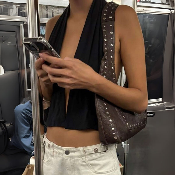 Womens studded tote bag crafted in luxe textured finish for bold sophistication. Metallic stud detailing frames the silhouette, bringing modern edge to timeless design.
