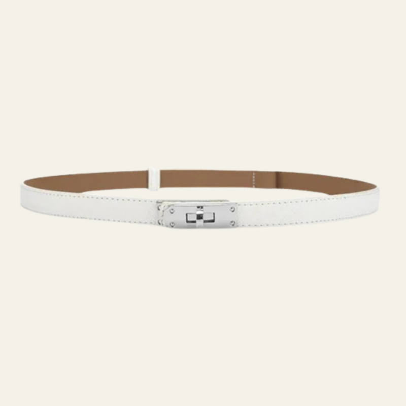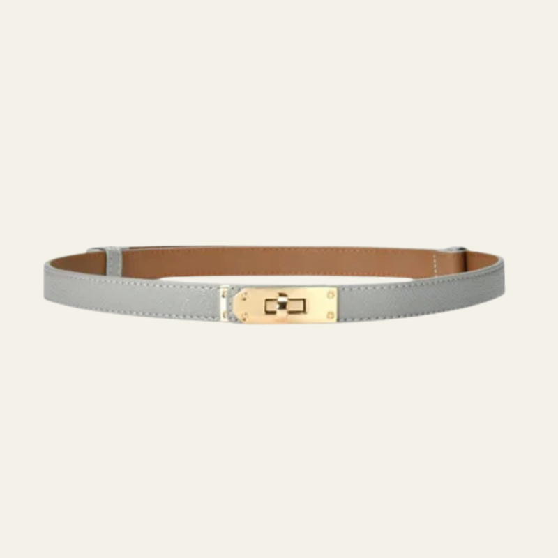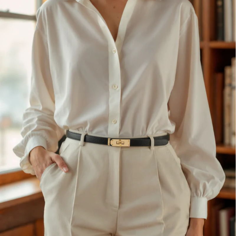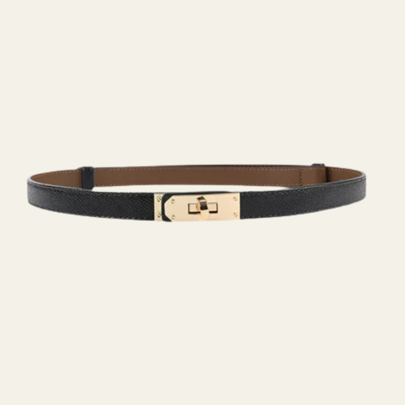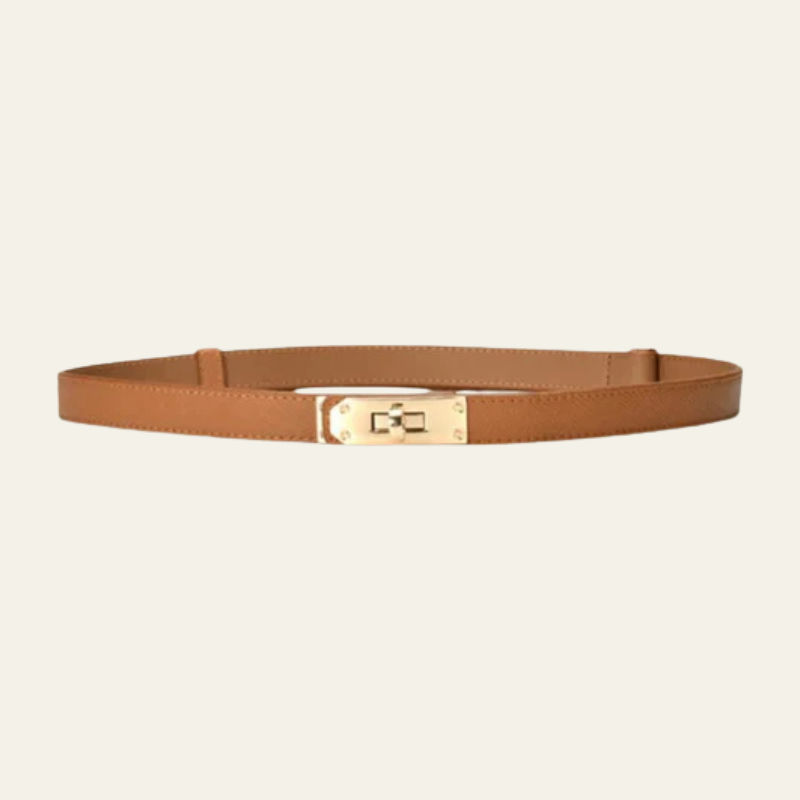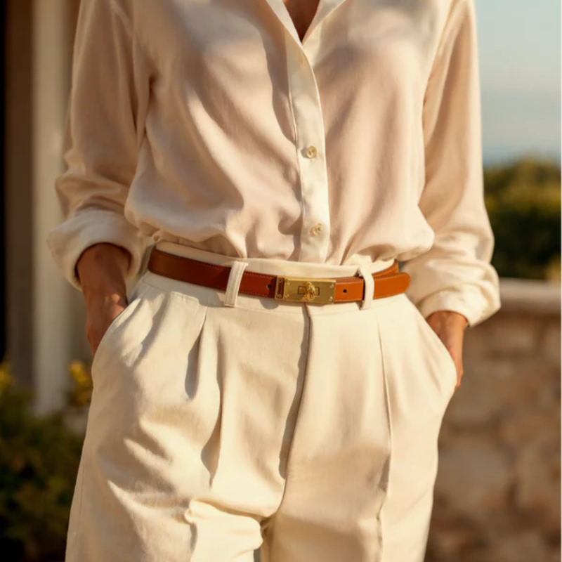 This women’s leather belt with a polished gold clasp embodies timeless elegance and quiet luxury.