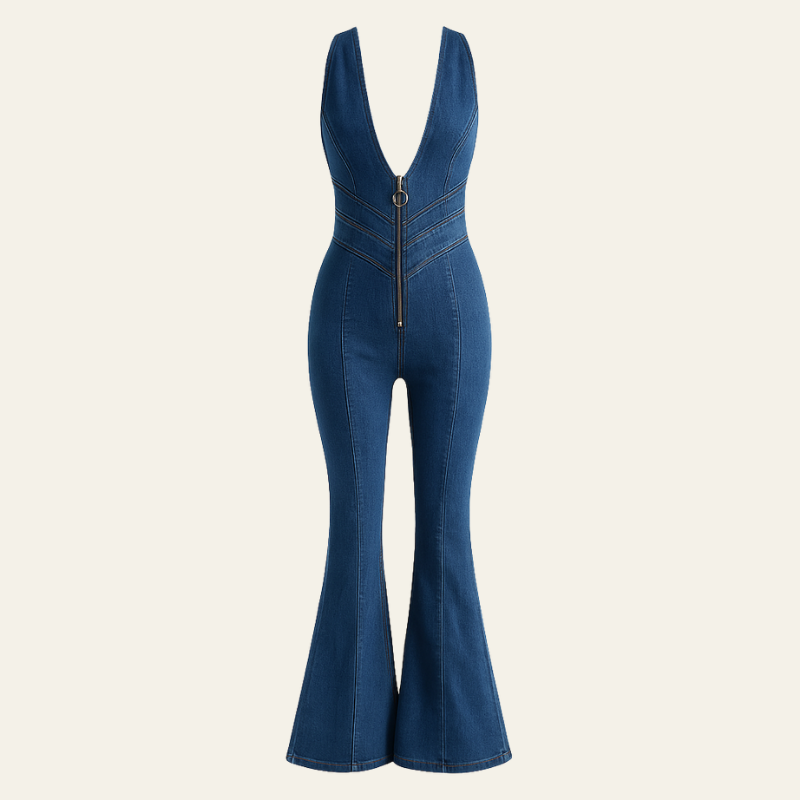The jumpsuit that will have everyone talking. A retro-inspired style, with seams that will hug your curves and give you that perfect corset effect. The Capri Curve-Hugging Denim Jumpsuit features a heart cutout back and is finished with a plunge neckline.