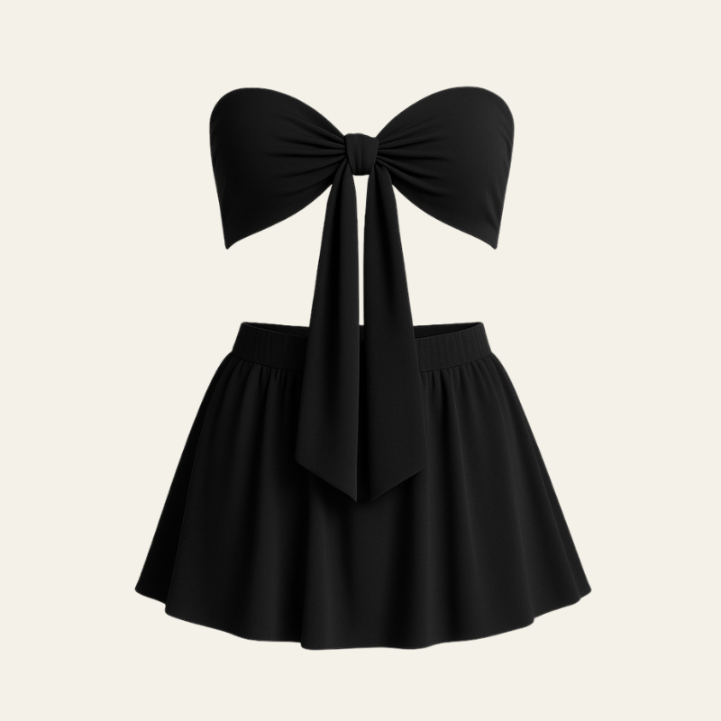 A refined women’s two-piece set tailored for timeless Mediterranean sophistication. Featuring a bandeau tie-front top and flowing mini skirt, it offers a polished yet effortless silhouette in lightweight fabric. Perfect for seaside evenings or styled with gold jewelry for summer escapes.