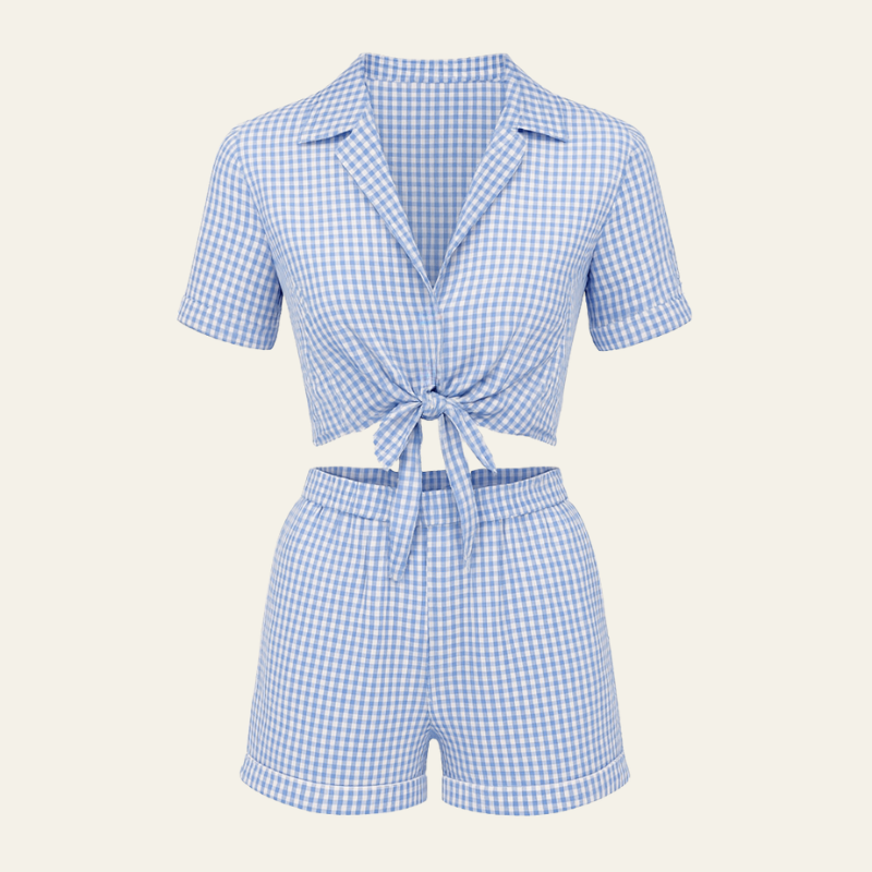 A refined women’s two-piece set in classic gingham, tailored for timeless coastal elegance. Featuring a tie-front shirt and high-rise shorts, it blends playful charm with polished European sophistication. Perfect for Riviera mornings or styled with sandals for seaside strolls.