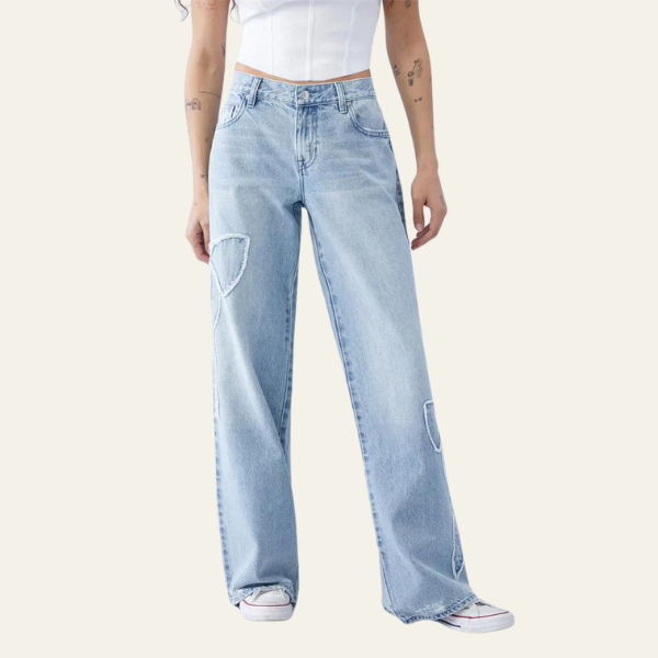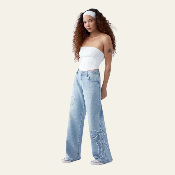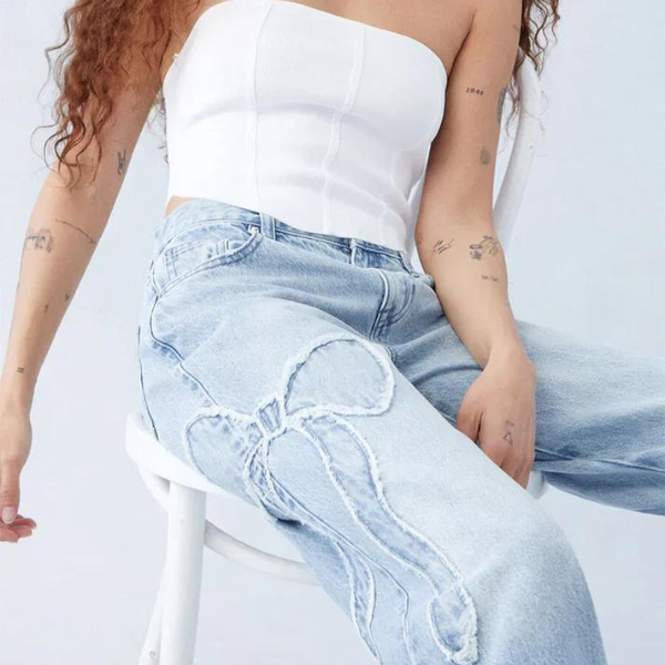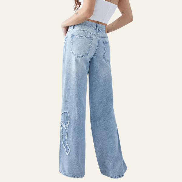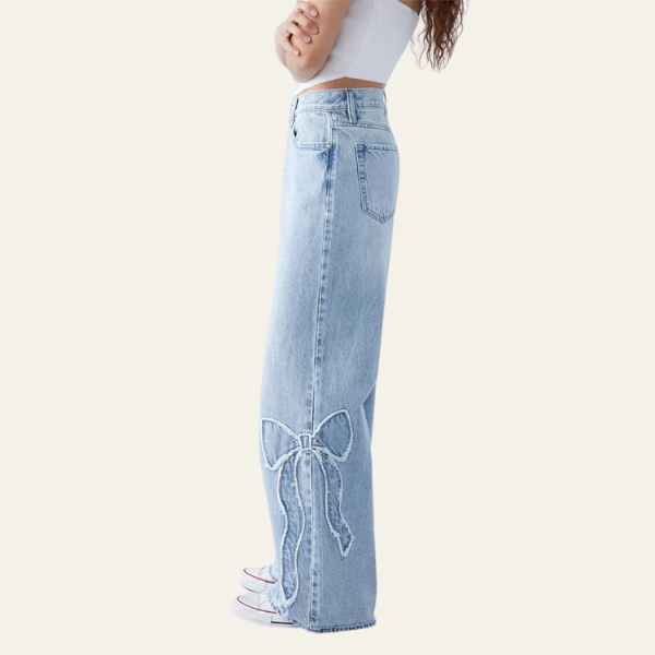 A women’s relaxed-fit denim jean with unique side bow detail, designed for casual sophistication.