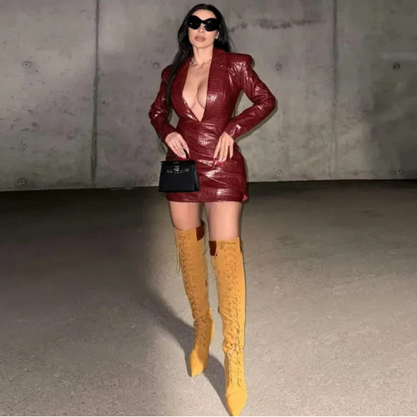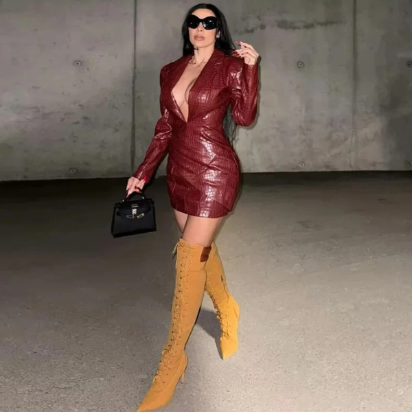 A women’s croc-embossed blazer dress that fuses bold tailoring with sleek sophistication. The structured silhouette and textured finish create a statement look that transitions seamlessly from evening events to elevated occasions. Perfect for pairing with heels or boots for a confident, refined ensemble.