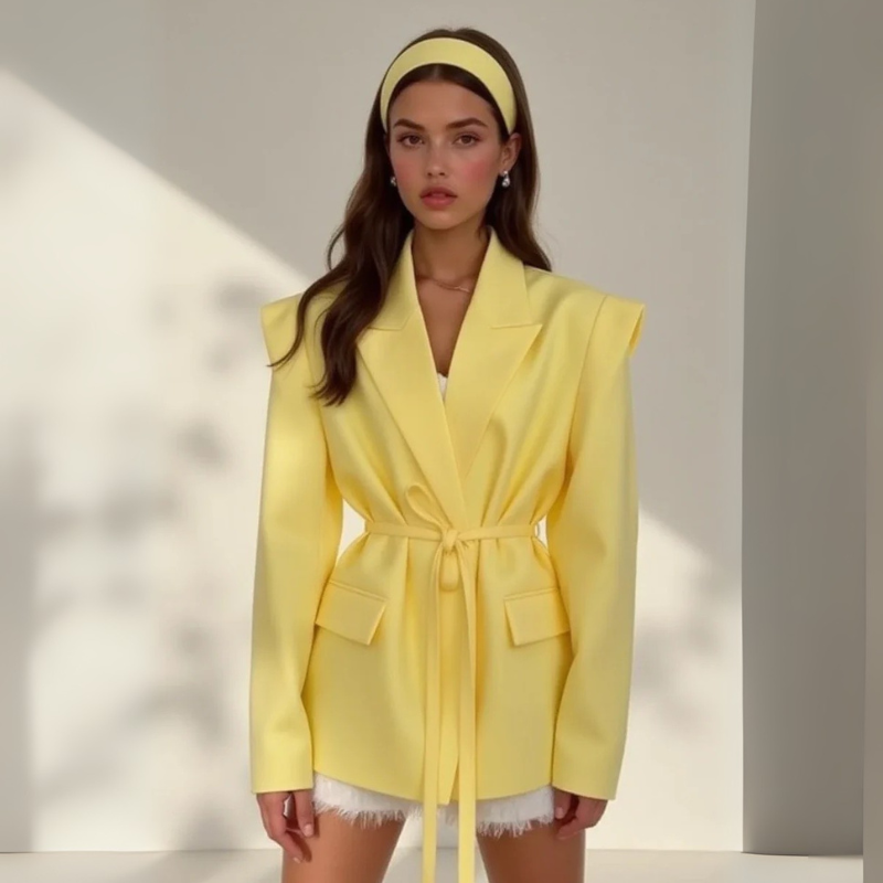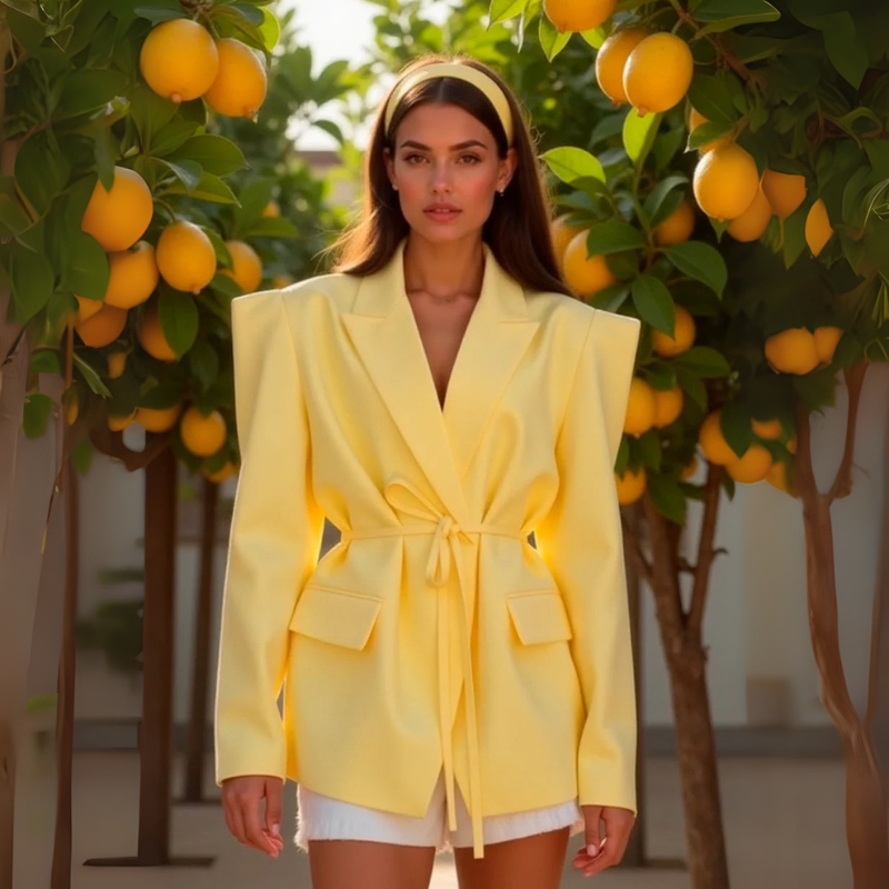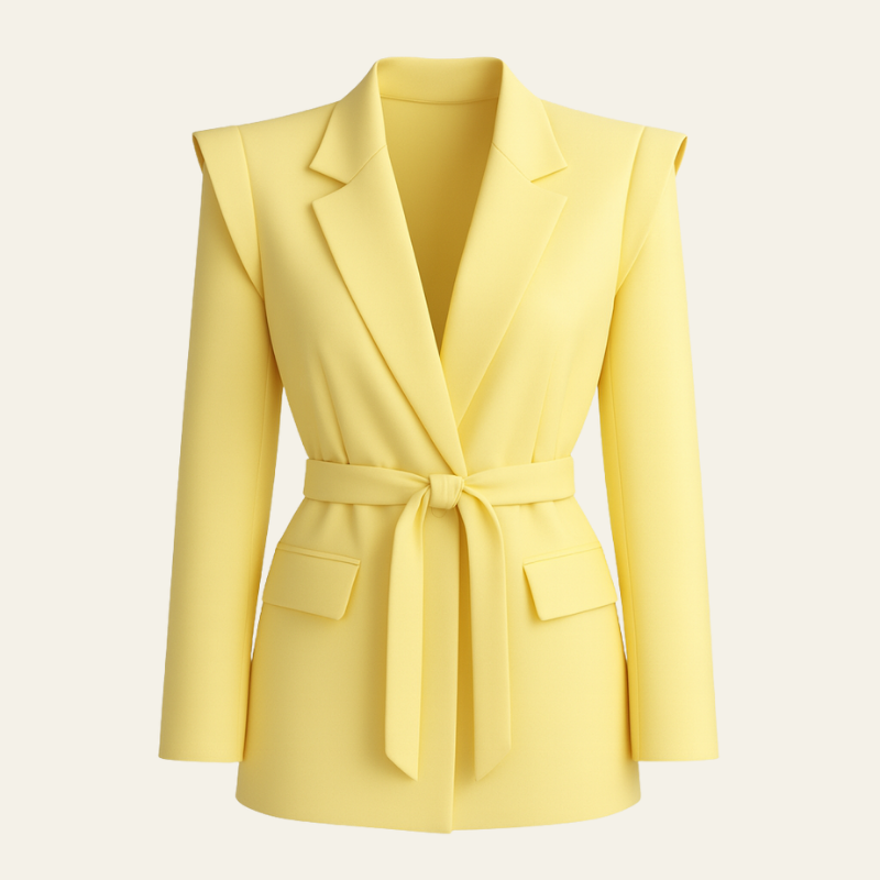 A women’s tailored blazer in a sunlit hue, designed for modern refinement with a Riviera spirit. Featuring structured shoulders, a belted waist, and a softly draped silhouette, it blends timeless tailoring with effortless femininity. Perfect for evening aperitifs, city strolls, or styled over resort wear for late-summer gatherings.