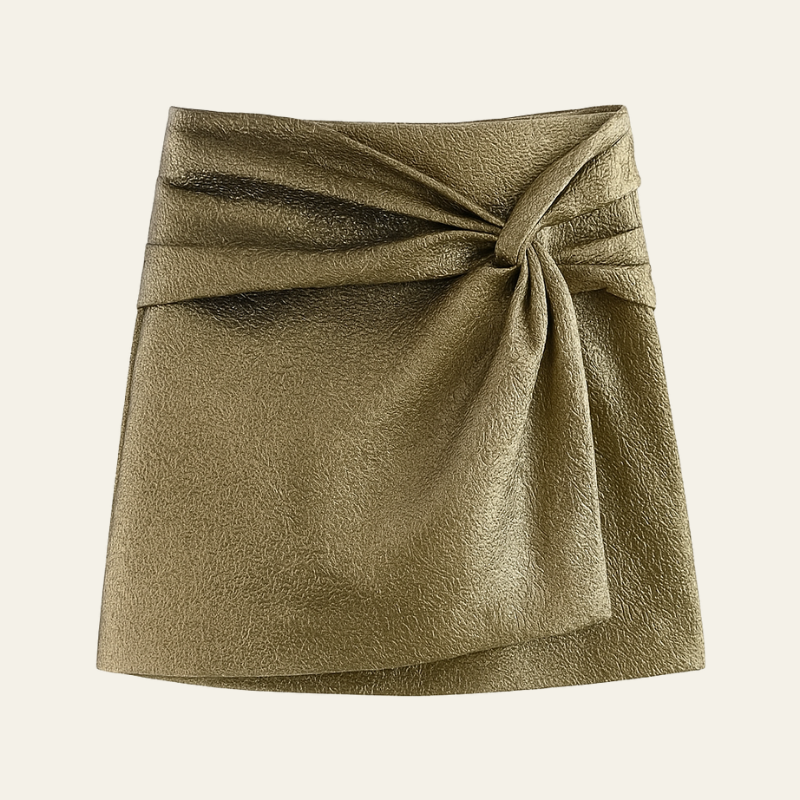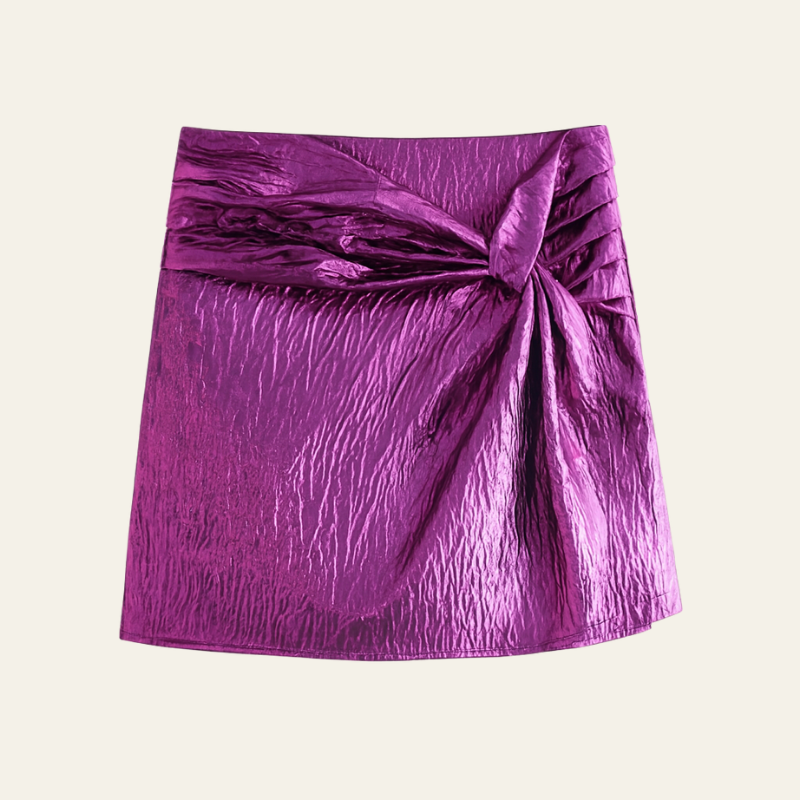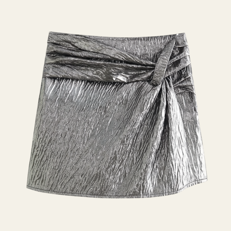 A women’s metallic draped skirt designed for timeless European elegance and evening sophistication. Cut in a sculpted silhouette with a knotted detail, it blends refined glamour with modern versatility. Perfect for Riviera holidays or city soirées, styled with a silk blouse and heeled sandals.
