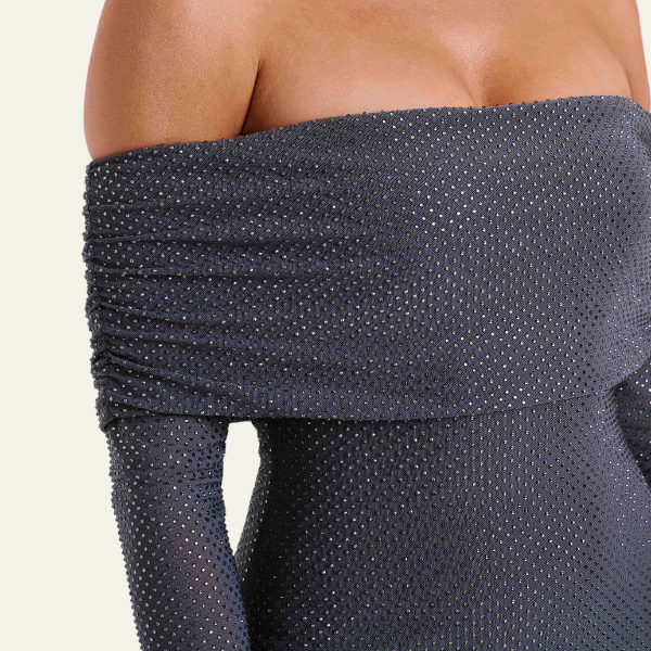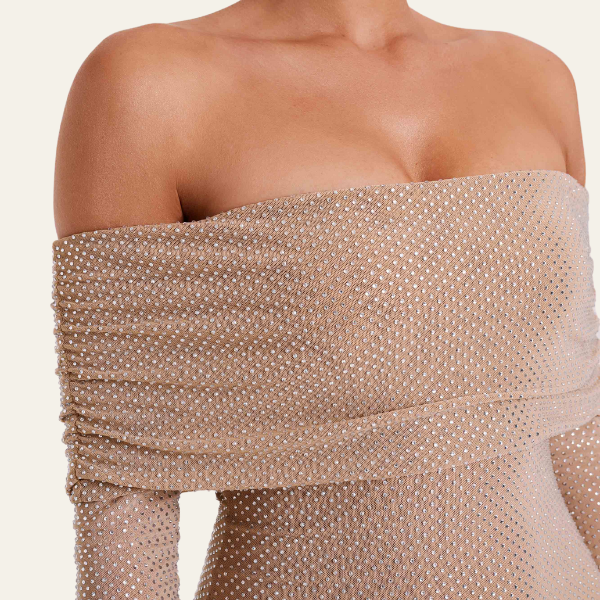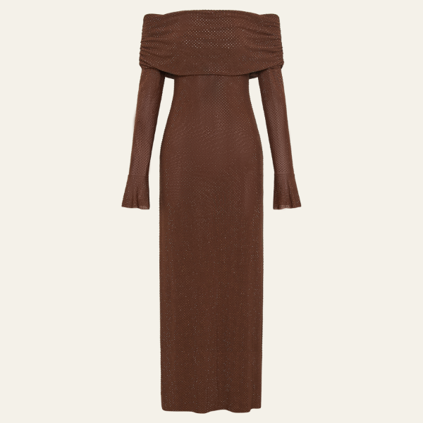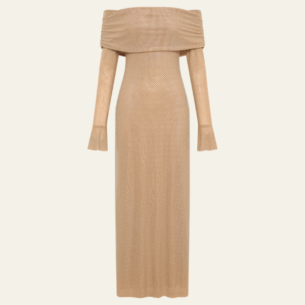 A women’s off-shoulder evening dress designed for timeless European refinement and understated luxury. With a softly draped neckline, flared cuffs, and a sculpted silhouette, it offers effortless sophistication and modern allure. Perfect for heritage gatherings or styled with heels for late-summer soirées.