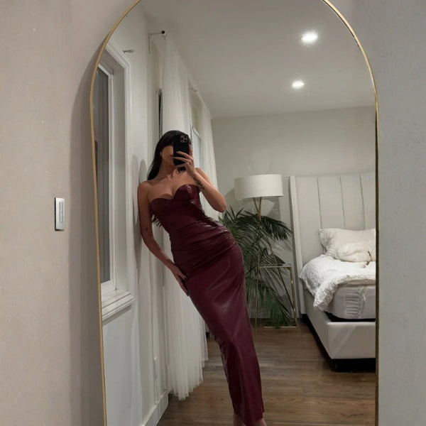 A women’s strapless vegan faux leather corset dress designed for powerful femininity and after-dark allure. Expertly structured with a sculpted bustier bodice and sleek pencil silhouette, it delivers both edge and elegance. Perfect for evening soirées, luxury dinners, and statement nights out.