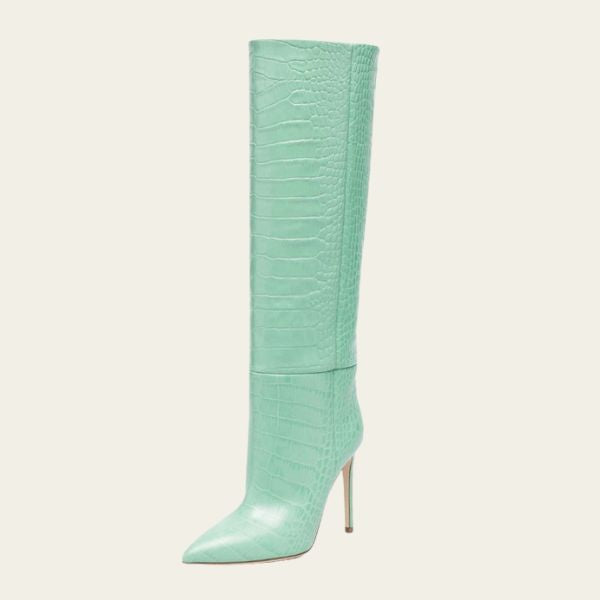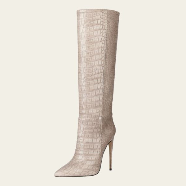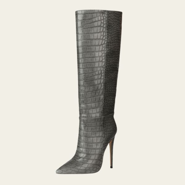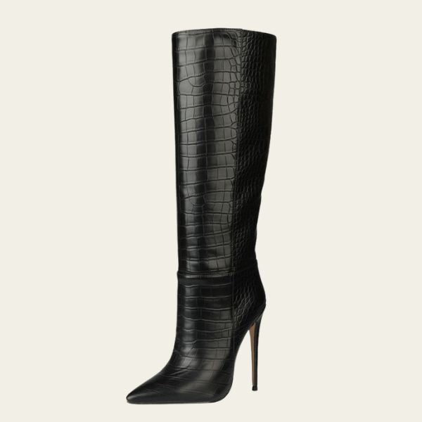 Womens mid-calf stiletto boot with a sleek pointed toe and refined stone pattern finish inspired by European runway design. Crafted for a slimming silhouette with elegant sleeve detailing that enhances leg definition. Ideal for elevated city wear, evening occasions, and confident all-season styling.