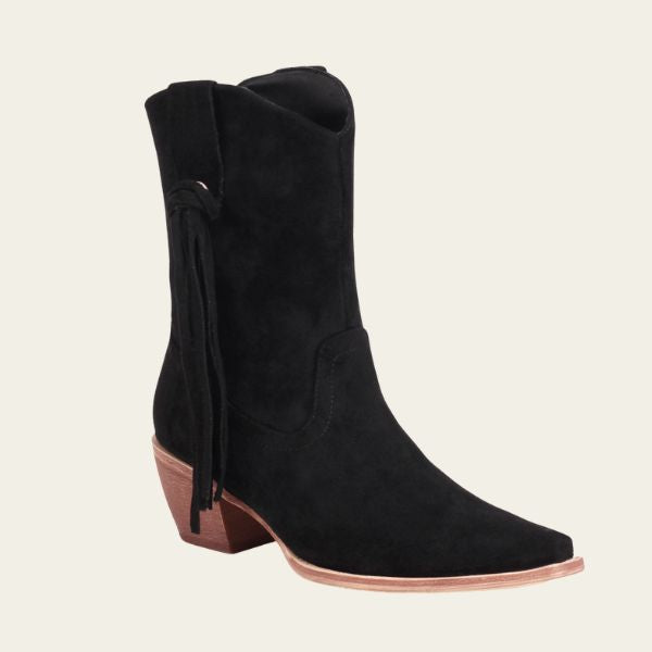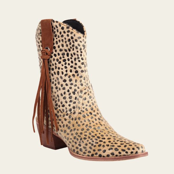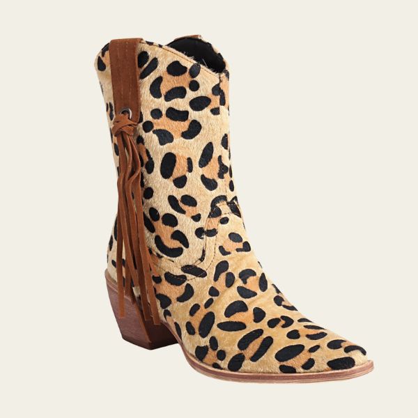 Womens leopard print short cowboy boot with tassel detail and a sturdy thick heel for autumn and winter styling. Crafted with Western-inspired stitching and bold texture, merging wild elegance with everyday comfort. Perfect for statement dressing, music festivals, or casual chic travel looks.