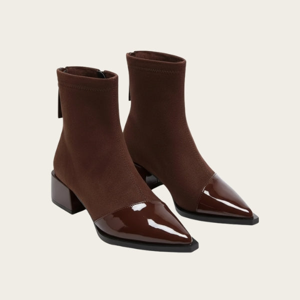 A women’s two-tone ankle boot blending vegan suede texture with vegan patent leather elegance for a refined, modern edge. Meticulously crafted with a square block heel and pointed toe for a sleek, structured silhouette. Perfect for city days, evening dinners, or polished fall styling.
