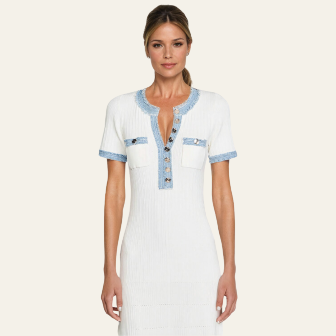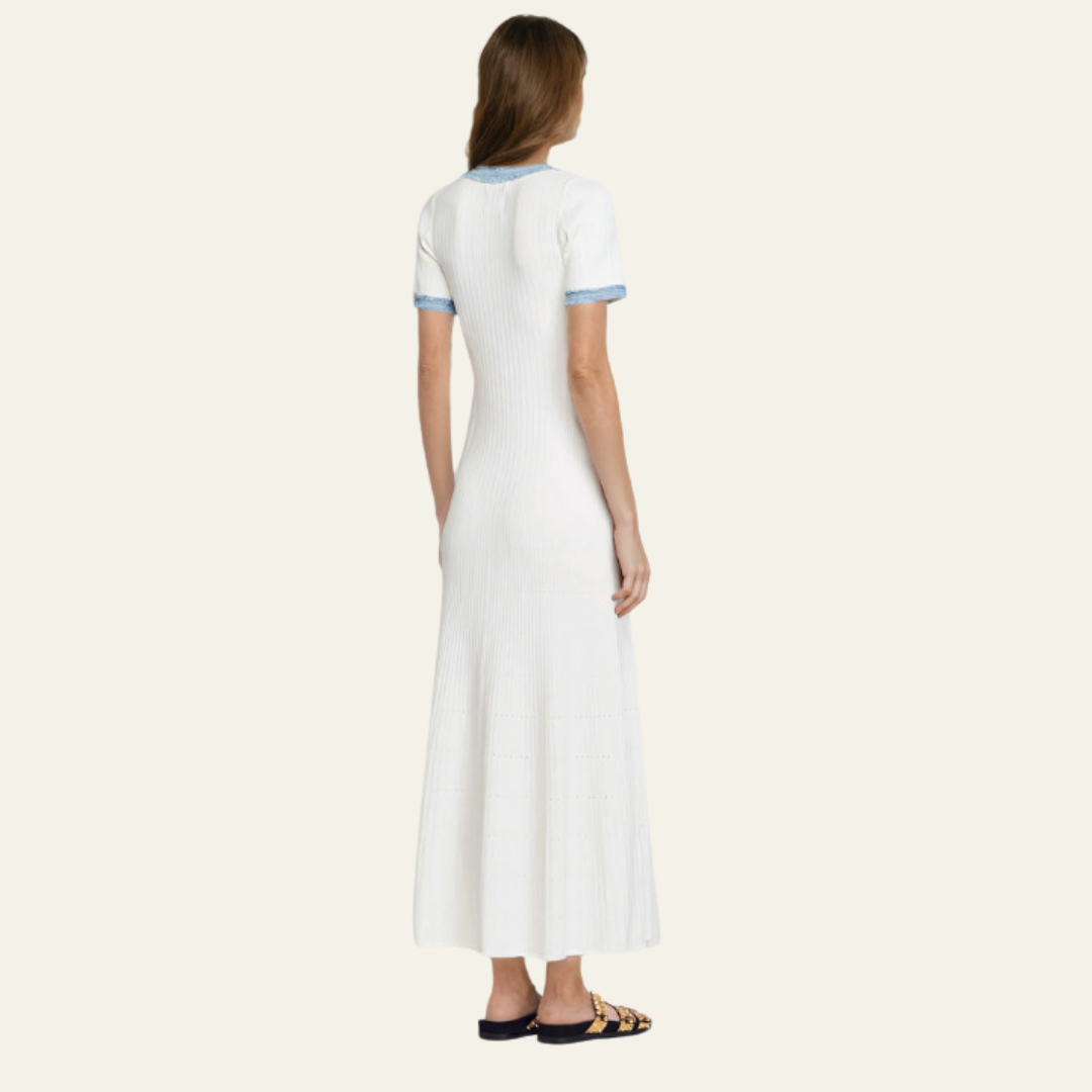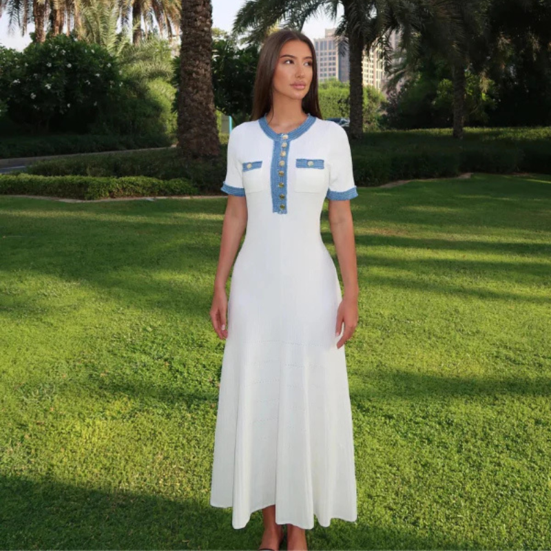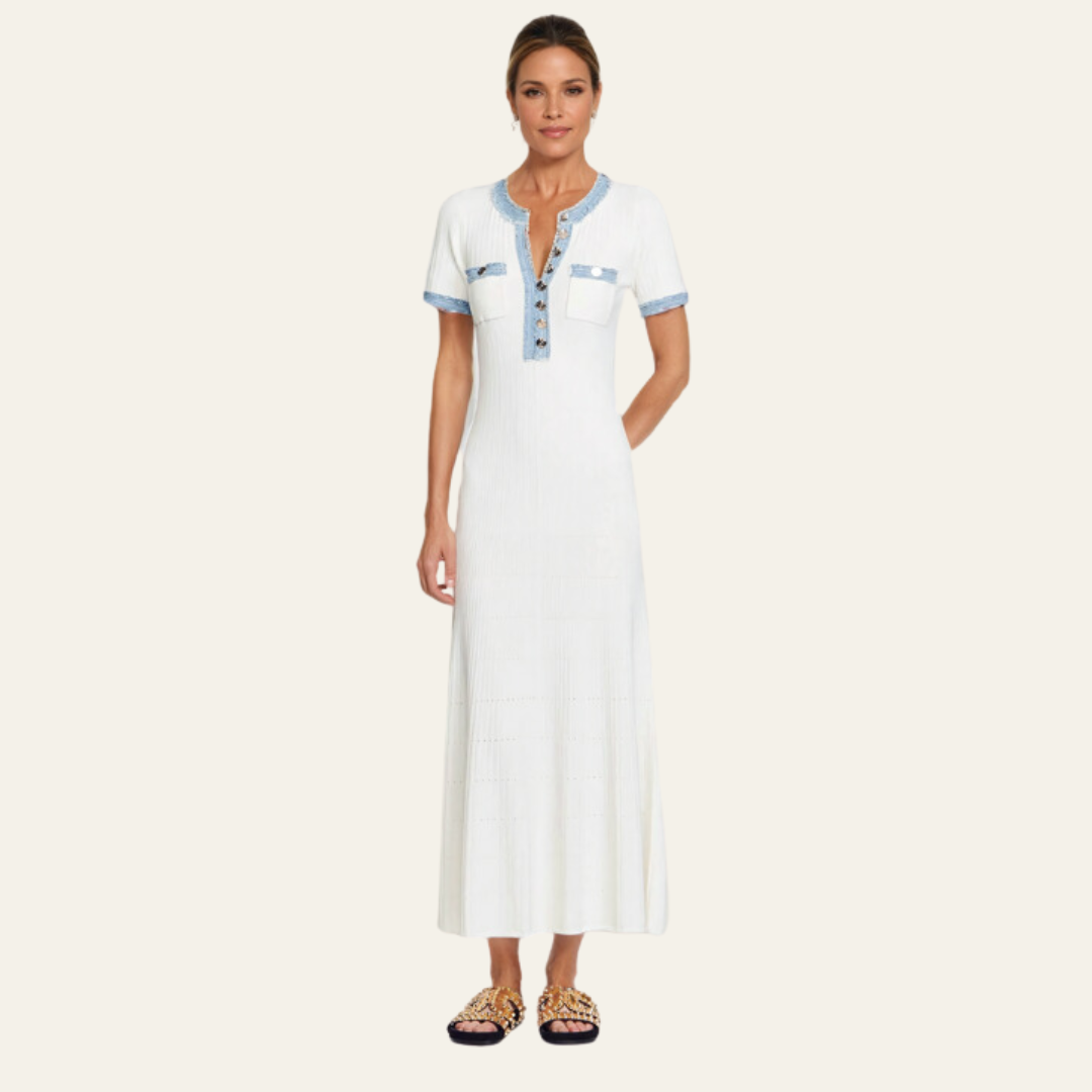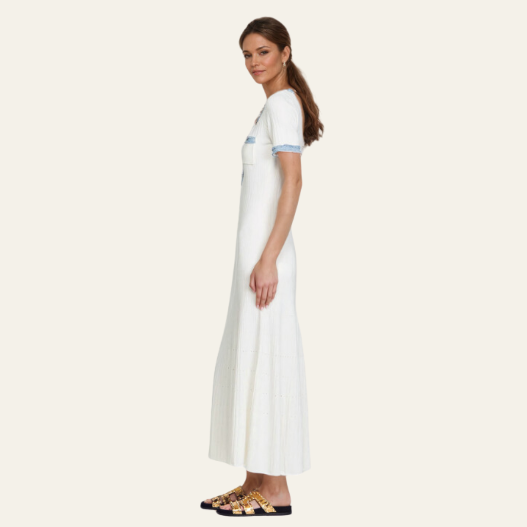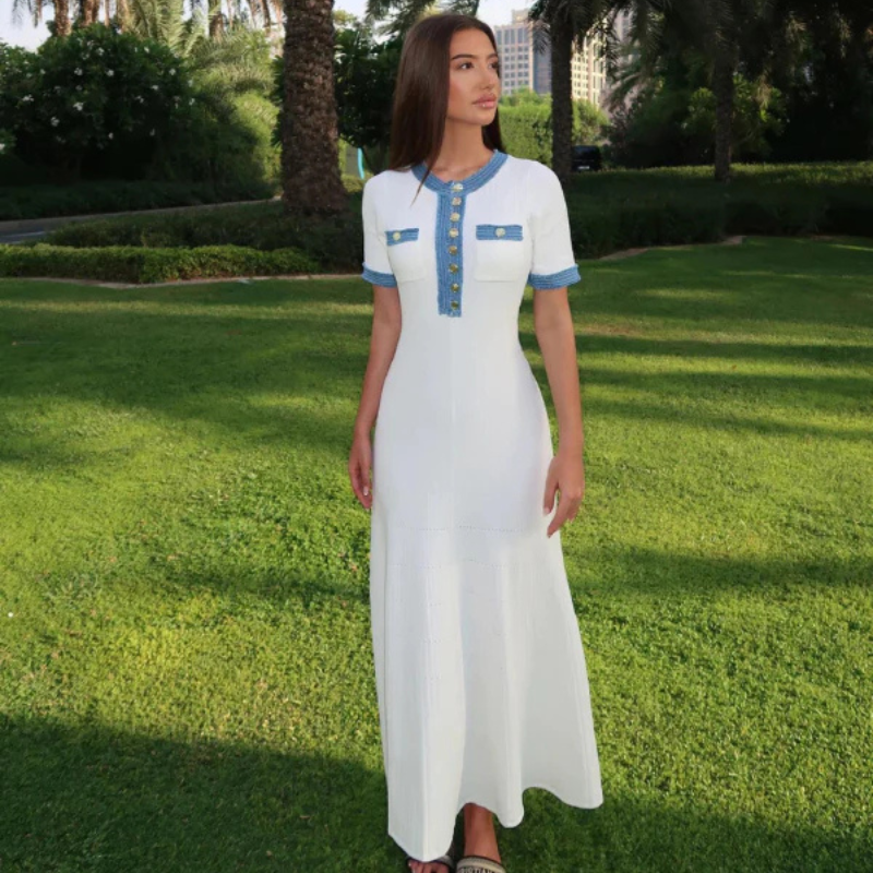 A knit maxi dress crafted for timeless coastal elegance and effortless refinement. Featuring contrast denim-inspired trim, gold-tone buttons, and a softly tailored drape, it blends understated luxury with modern femininity. Perfect for seaside strolls or garden parties on late-summer evenings.