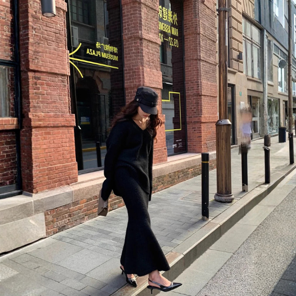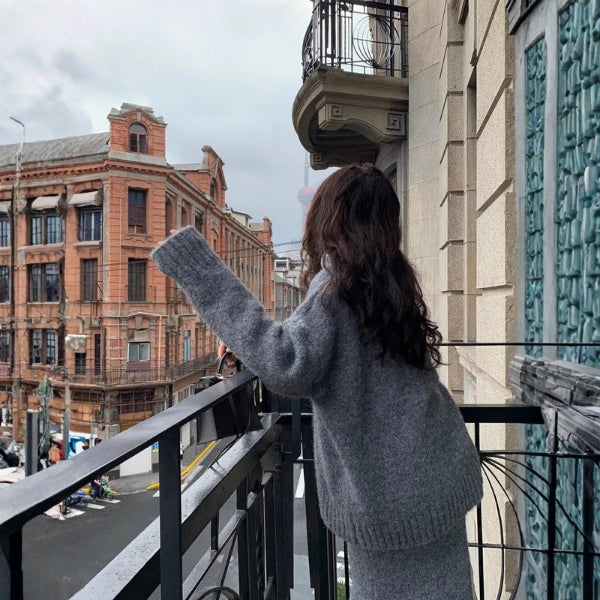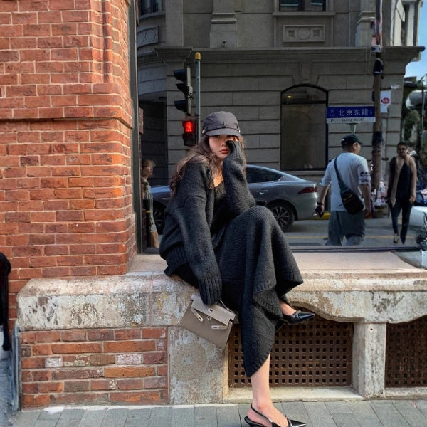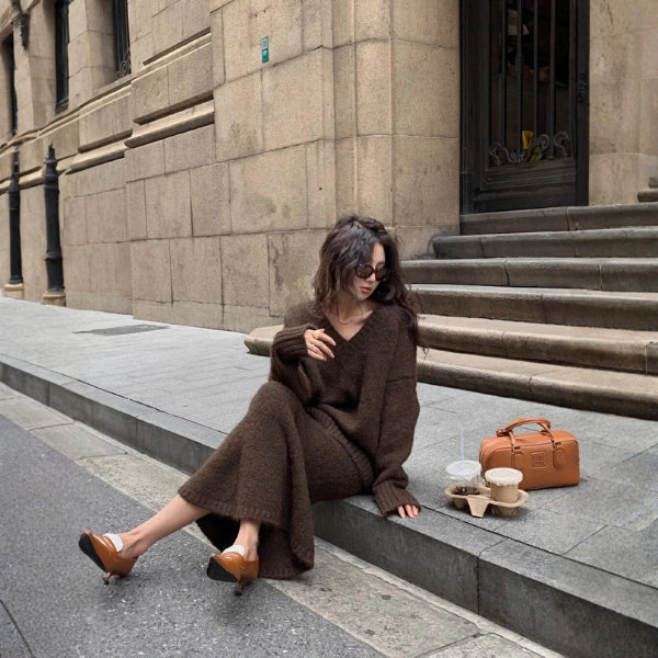 A women’s knit two-piece set exuding understated luxury in a deep, earthy tone. Featuring a relaxed V-neck sweater and a flowing midi skirt for seamless elegance and warmth. Perfect for cozy dinners, city strolls, or refined weekend lounging.