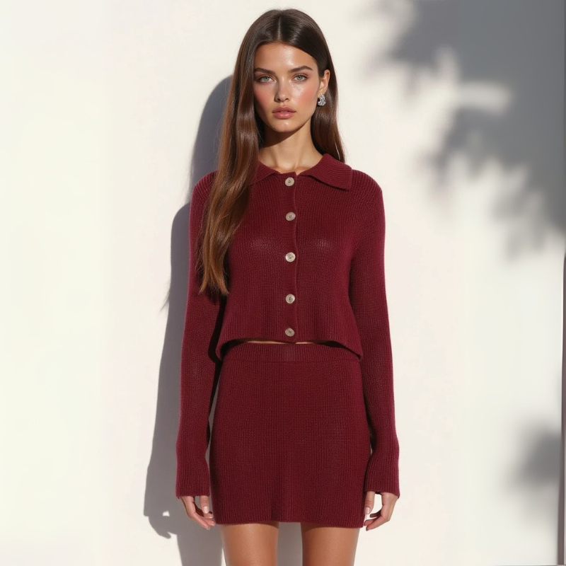 A women’s knit set crafted for timeless sophistication and modern elegance. Featuring a softly draped cardigan with matching skirt, it delivers understated refinement and versatile wearability. Perfect for autumn evenings or styled with boots for elevated gatherings.