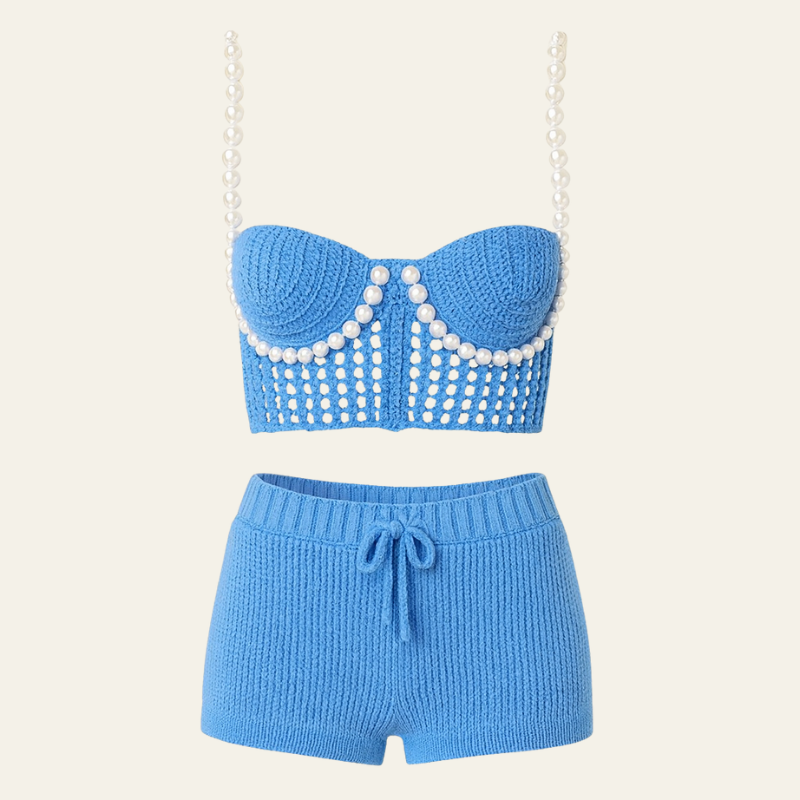 A women’s crochet set crafted for timeless Riviera elegance, blending artisanal texture with pearl-detailed straps for refined femininity. The structured bustier and drawstring shorts create a flattering silhouette with breezy comfort and coastal charm. Ideal for seaside aperitifs, garden parties, or paired with sandals on sunlit escapes.
