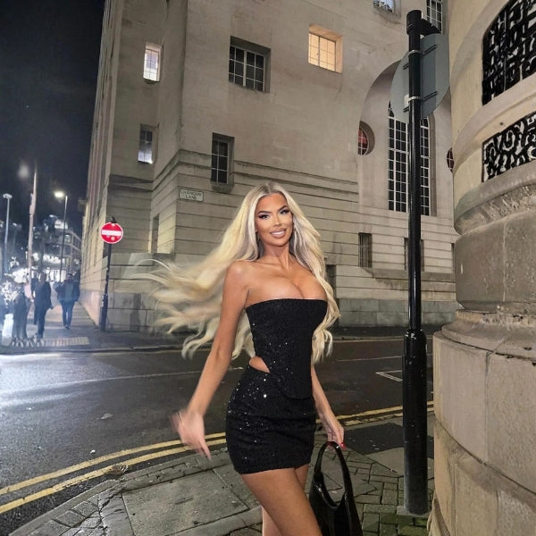 A women’s strapless two-piece set featuring a structured corset top and fitted mini skirt, adorned with shimmering sequins for a radiant finish. Designed to sculpt the silhouette, it captures bold sophistication — perfect for evening events or festive nights out. Available in icy blue and midnight black for versatile glam styling.