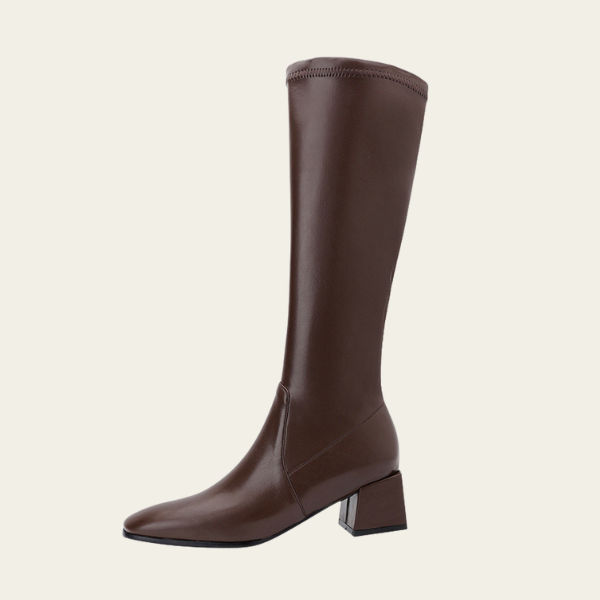 A refined women’s vegan leather knee boot designed for timeless sophistication and everyday ease. Crafted in supple leather with a softly contoured shaft and stable block heel, it delivers both structure and comfort. A versatile companion that transitions seamlessly from city strolls to weekend gatherings in effortless poise.